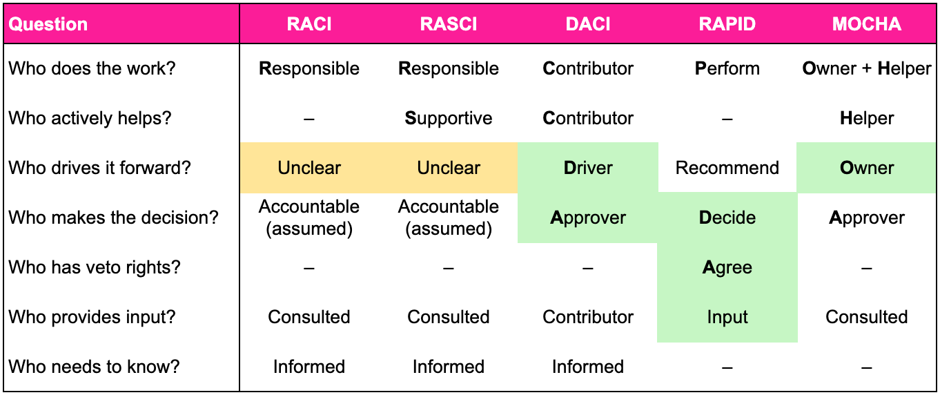 Why not MOCHA? It has an Owner role that functions like a Driver, but is less known in enterprise contexts. DACI achieves the same outcome with less friction.