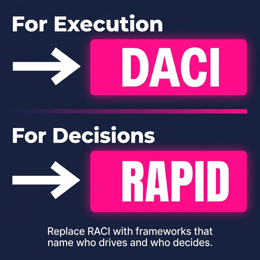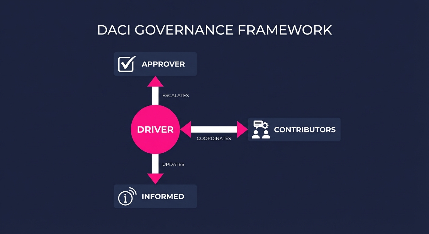 Five governance frameworks exist. For transformation execution, DACI wins: it explicitly names the Driver and the Approver. For steering committee decisions, add RAPID: it explicitly names the Decider and separates input from veto.