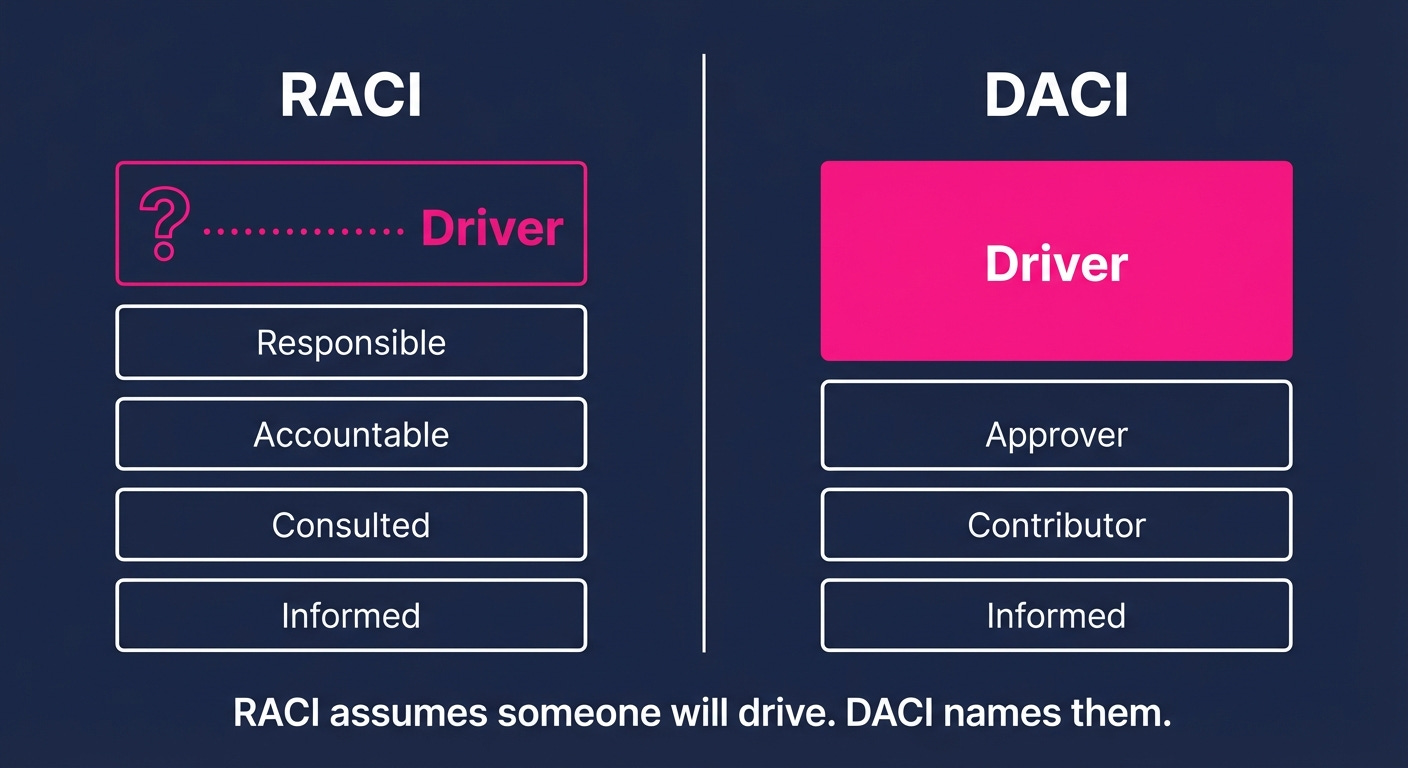 When you have vendors, clients, and third parties sharing responsibilities, DACI forces clarity on who is driving coordination, not just who is doing their piece.